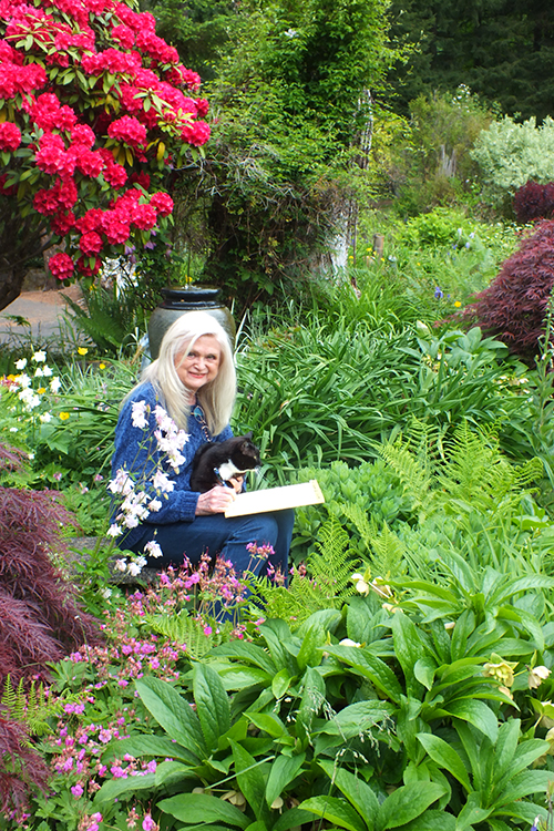 Gerry writes her thoughts and holds her cat, Coco in her garden sanctuary.