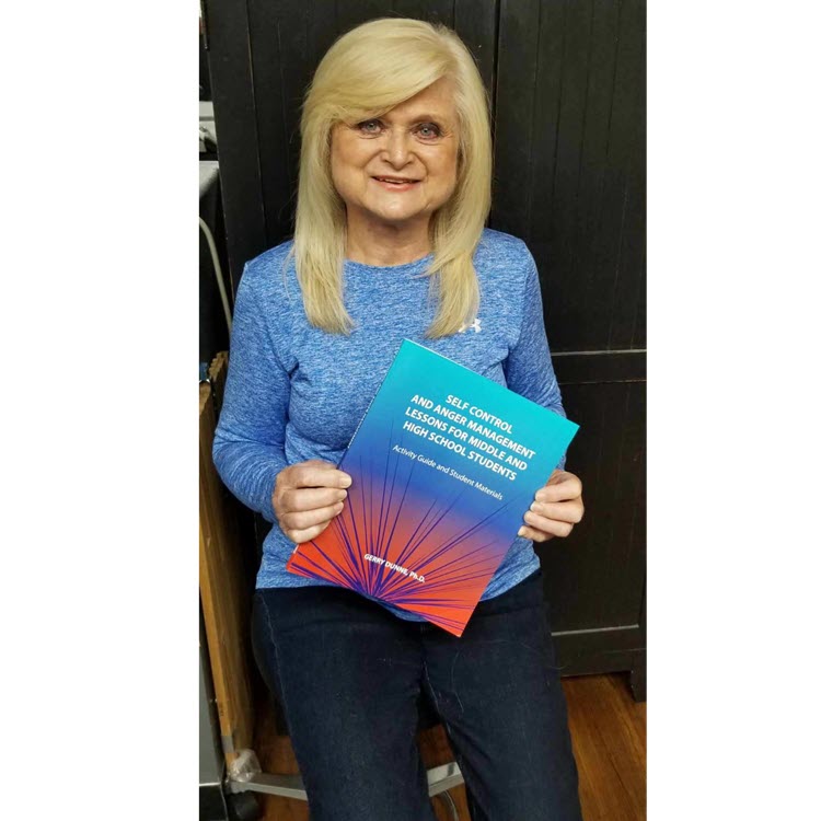 The image on the left shows Gerry holding one of her recent curriculum guides for teachers and counselors, Self Control and Anger Management for Middle and High School Students: Activity Guide and Student Materials.