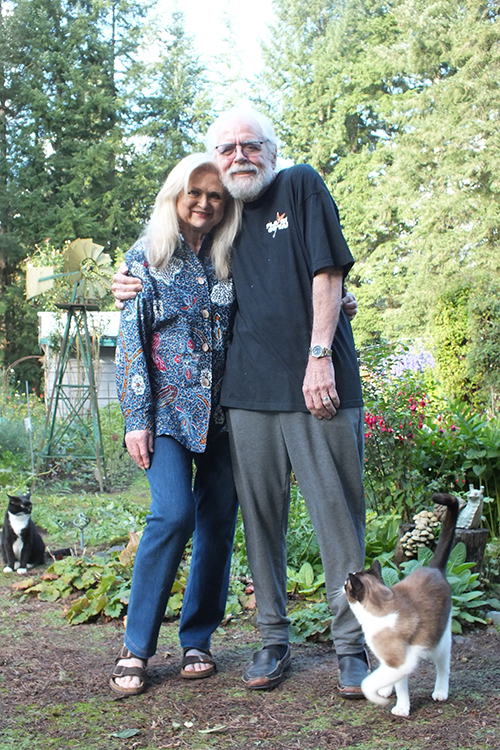 Gerry and Dennis enjoying the garden with Coco and Cuddles.